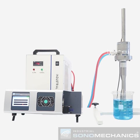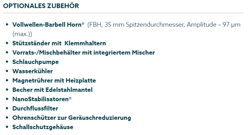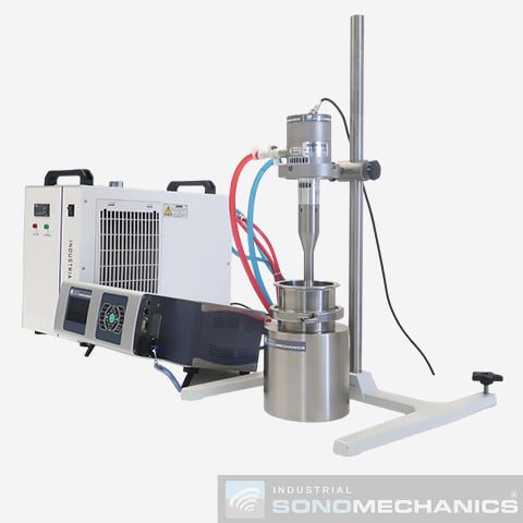 The BSP-1200 ultrasonic liquid processor comes standard with: 1200 W ultrasonic generator, water-cooled transducer, half-wave Barbell Horn®, flow-through reactor chamber (flow cell), heavy-duty support stand, spanner wrench set, and noise reduction ear muffs. Optional items include: full-wave Barbell Horn®, storage/mixing tank with integrated mixer, peristaltic pump, water chiller, magnetic stirrer with hotplate, jacketed beaker, NanoStabilizers®, and filters.