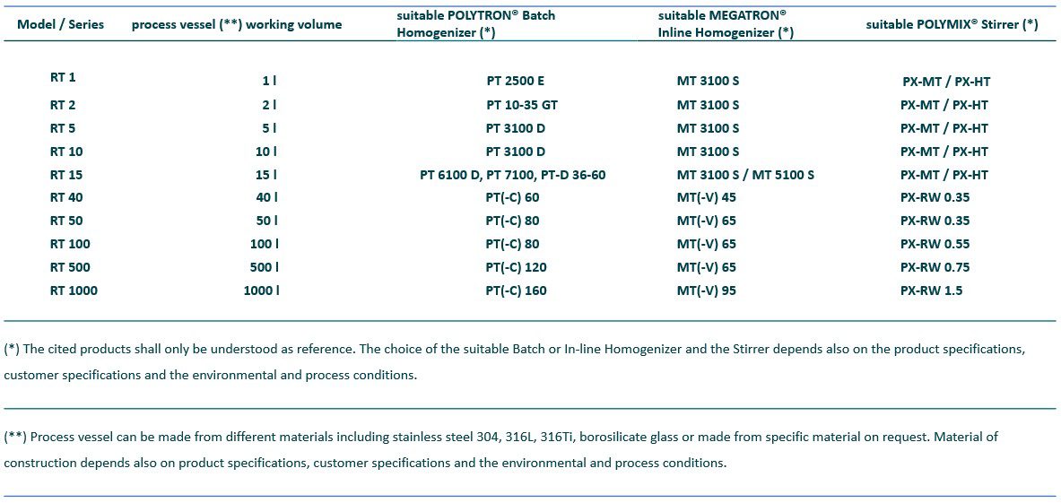 REACTRON® laboratory systems consist of process vessels (single and multiple wall, standard and customer-specific designs), stirring systems for macro-mixing (e.g. with anchor stirrer), POLYTRON® / MEGATRON® homogenisers and mixing systems for crushing and micro-mixing, pipework, process controls and accessories, in alignment with the customer, product and process.
