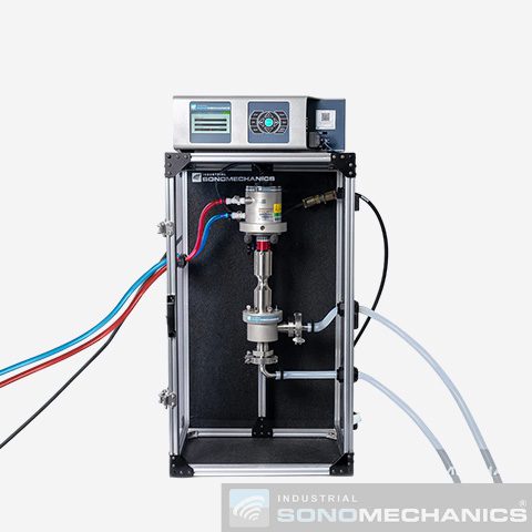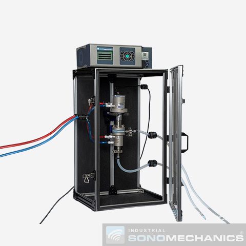 Ultrasonic liquid processors (a.k.a. sonicators, ultrasonic homogenizers) are frequently utilized in shared work spaces. The noise emitted by these devices, however, can cause significant discomfort and must be mitigated. This noise-reduction enclosure brings the noise down to a comfortable level that is in compliance with the U.S. and European regulations and allows for a clear 270-degree view of the enclosed equipment. The enclosure is small enough to move around, yet sufficiently large to provide convenient access to the equipment and work product.